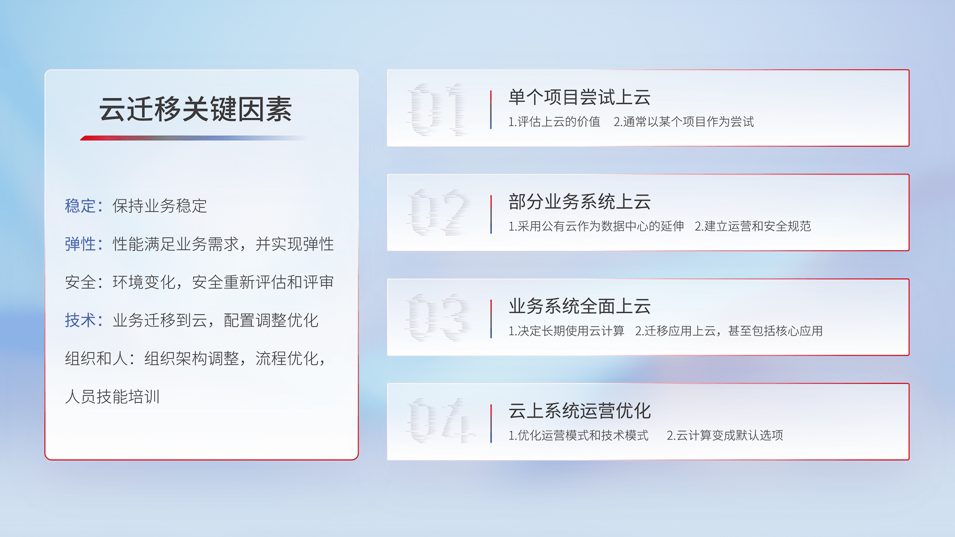 结合实际业务,,从规划设计、、云平台选型、、、云原生改造、、数据迁移、、集成交付,,,,迁移全过程为客户识别最佳上云路径,,做好风险识别管理,,,设计网络架构、、、身份权限、、、安全审计合规、、操作审计、、、、日志审计、、、、监控告警策略、、、、多站点容灾设计等,,,对云上基础设施进行整体规划,,,提升IT治理水平,,,,以满足弹性、、、、高可用、、、高性能的需求。。