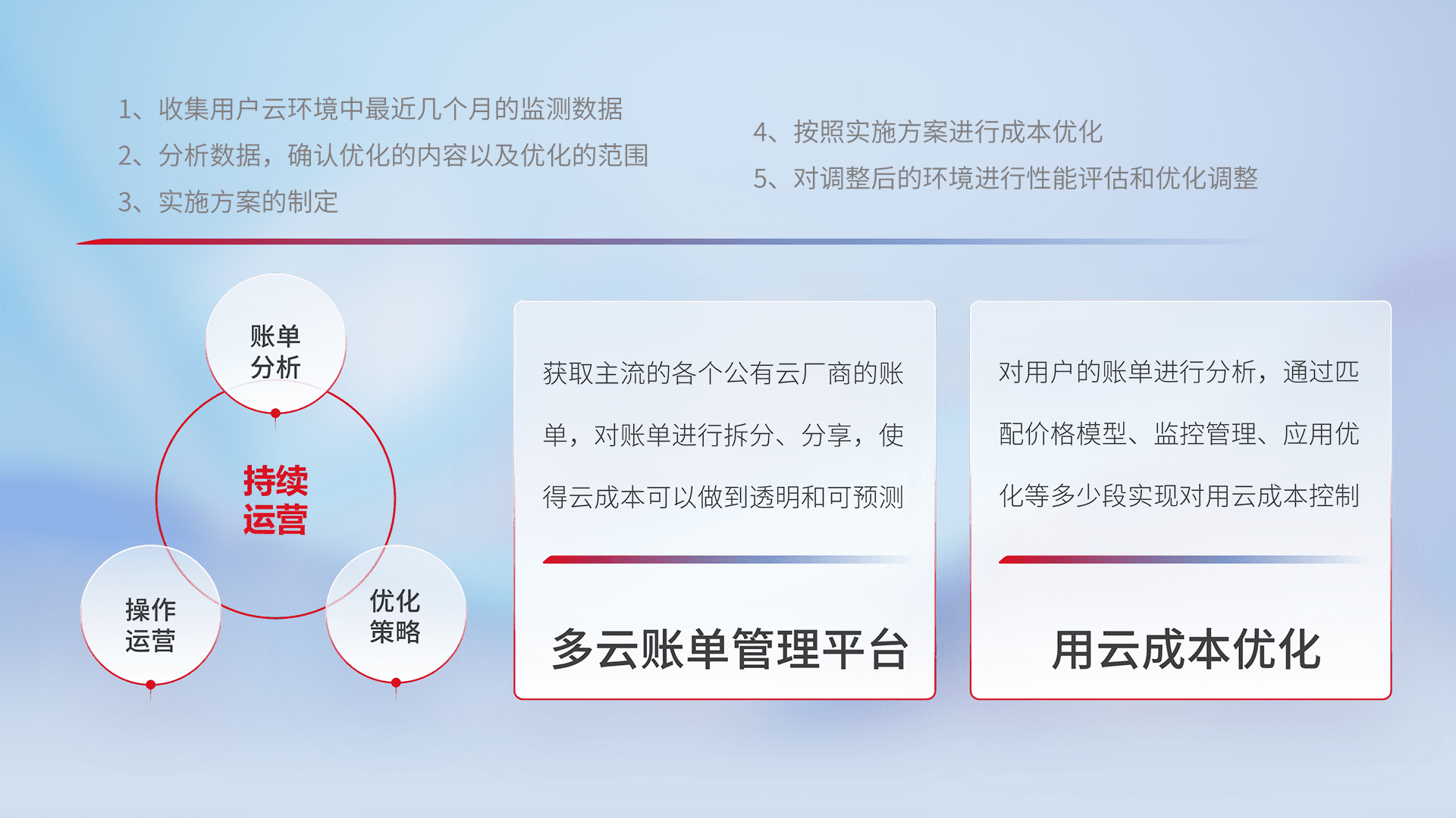 通过多云纳管,,,,以统一的资源数据模型把客户的云资源进行抽象和封装,,进而实现对多云资源的统一操作,,,,保障云资源管理的可靠性、、稳定性与可用性。。。量身定制化运维内容,,,配置、、、、开发运维、、、补丁管理、、备份、、、监控、、认证和访问管理、、、审计和日常巡检等,,,,保障在用云过程中的可靠度,,,,稳定度以及高可用率。。。。